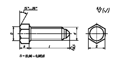 Винт установочный с шестигранной головкой и ступенчатым концом, класс точности A и В ГОСТ 1483-84. Класс точности: A, B. Поле допуска резьбы: 6g. Класс прочности: 14H, 25H.
